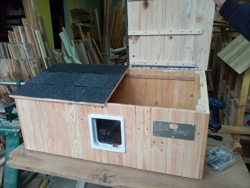 Cabane en palette prévue pour l’extérieur avec une partie nuit et une partie repas avec une fenêtre. Ouverture d’une partie du toit pour permettre au personnel (vous, humain) de réapprovisionner sa majesté en croquettes et eau fraiche. L’extérieur est traité à l’huile de lin et la couverture est faite en plaques goudronnées permettant une bonne étanchéité.